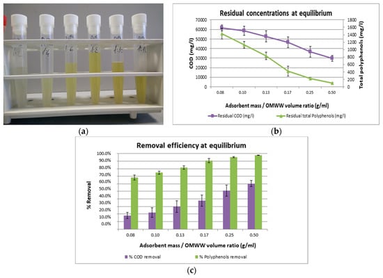 (a) Filtered solutions of OMWW, resulting from batch tests with Purosorb™PAD428 resin. (b) Residual concentrations of chemical oxygen demand (COD) and total polyphenols, at adsorption equilibrium, for the Purosorb™PAD428 resin. (c) Removal efficiency for COD and total polyphenols, at adsorption equilibrium, for the Purosorb™PAD428 resin. Mean values (n = 5) ± SD were calculated.