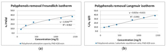 The isotherm of total polyphenols adsorption onto Purosorb™PAD428 resin is depicted in Figure 3a, in which the R2, associated with the Freundlich model fitting, is indicated. It is observed that the curve is concave downward, indicating a favorable isotherm leading to high adsorption capacity, as depicted in the values of Langmuir constants. In the fixed-bed adsorption column, a strongly favorable isotherm would also lead to a short mass transfer zone [].