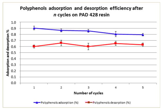 Polyphenols adsorption and desorption efficiency on Purosorb™PAD428 resin related to working cycle number. Mean values (n = 5) ± SD were calculated.