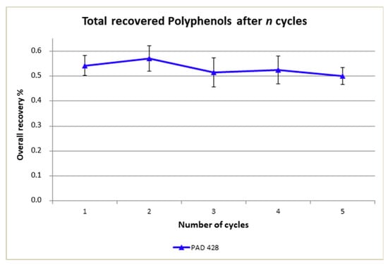 Figure 5 reports the overall polyphenols recovery. The recovery efficiency reduction, after five cycles, was of −7.5% (from 54% to 50%) for Purosorb™PAD428, even if a statistical analysis will be necessary for a better evaluation of data.