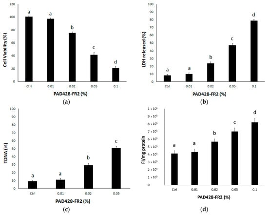 Lactic dehydrogenase (LDH) release was evaluated on SIRC cells untreated and treated with different concentrations of PAD428-FR2 (0.01%, 0.02%, 0.05%, 0.1%) for 24 h, measuring spectrophotometrically in the culture medium and in the cellular lysates, at λ = 340 nm by analyzing NADH reduction []. The percentage of lactic dehydrogenase release was calculated as the percentage of the total amount, considered as the sum of the enzymatic activity present in the cellular lysate and that in the culture medium.