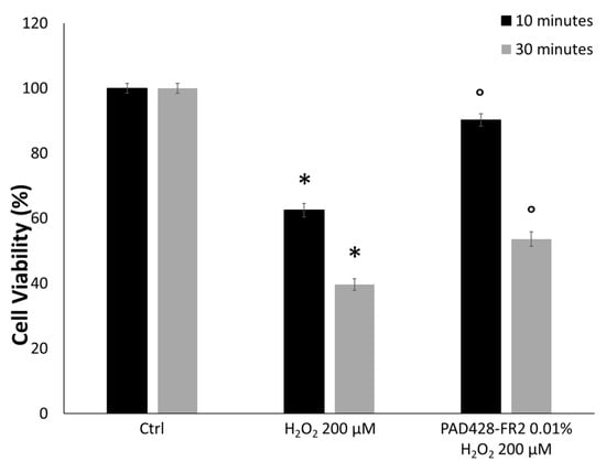SIRC cells were pretreated with PAD428-FR2 0.01% for 24 h and then stimulated with H2O2 (200 µM) for 10 and 30 min. Untreated cells were used as negative control; cells treated with H2O2 (200 µM) were used as a positive control. After treatments, cell viability was evaluated by MTT assay as previously described.