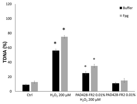 The alkaline comet assay was performed on SIRC cells untreated and treated with PAD428-FR2 (0.01%, 0.02%, 0.05%) for 24 h. The minigels were prepared as described by Tomasello et al. (2017) []. Then, as described by Di Mauro et al. (2017) [], the alkaline version of the comet assay was performed. An analysis of fifty nucleoids for each sample was carried on by using an epifluorescence microscope (Leica, Wetzlar, Germany) equipped with a camera. DNA damage was evaluated by using CASP (1.2.2) image analysis software. Results were expressed as the percentage of fragmented DNA present in the comet tail (%TDNA).