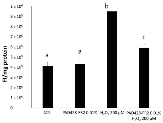 ROS levels evaluated on SIRC cells pretreated with PAD428-FR2 0.01% for 24 hours and then stimulated with H2O2 (200 µM) for 30 minutes. Untreated cells were used as a negative control; cells treated with H2O2 (200 µM) were used as a positive control. The results were expressed as fluorescence intensity per mg protein. Values are mean ± SD of three experiments in triplicate. Bars with different letters are significantly different (p < 0.05).