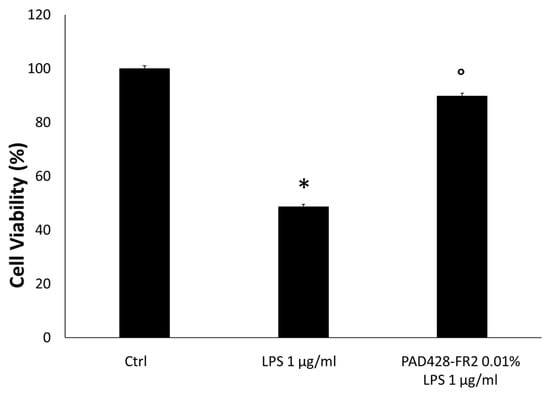 MTT assay performed on SIRC cells pretreated with PAD428-FR2 0.01% for 2 h and then stimulated with lipopolysaccharide (LPS) (1 μg/mL) for 24 h. Untreated cells were used as a negative control; cells treated with LPS (1 μg/mL) were used as a positive control. The results are expressed as the percentage of cell viability with respect to untreated control cells (Ctrl). Values are mean ± SD of three experiments in triplicate. * p < 0.05 vs. control group; ° p < 0.05 vs. LPS-treated cells.