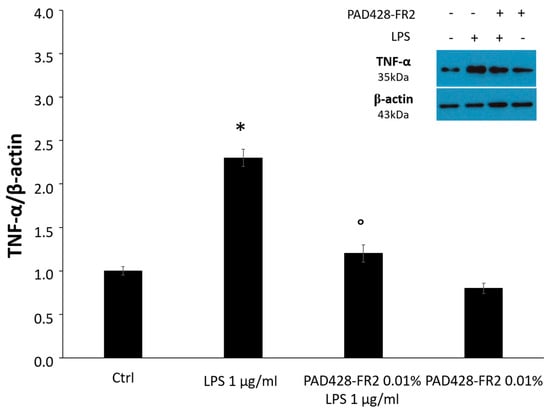 TNF-α levels evaluated by Western Blot analysis performed on SIRC cells pretreated with PAD428-FR2 0.01% for 2 h and then stimulated with LPS (1 μg/mL) for 24 h. Untreated cells were used as a negative control; cells treated with LPS (1 μg/mL) were used as a positive control. β-actin was used as the loading control. Values are mean ± SD of three experiments in triplicate. * p < 0.05 vs. control group; ° p < 0.05 vs. LPS-treated cells.