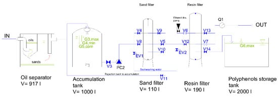 A prototype pilot plant was developed to scale up the laboratory process. Purosorb™PAD428 was used as an adsorbent phase since it gave the best results in the laboratory phase as described in the “Results and Discussion” section. Since residual oils and sand present in the input waters can cause problems of clogging, accumulation, and eroding or obstructing pipes and machinery, the first stage was the de-oiling and sand removal; a steel tank in which OMWW was released with a flow rate of 0.5 m3/h and working simultaneously as a settler and oil-separator was used. De-oiled OMWW was then conveyed into a storage tank, and forced with a flow rate of 300 L/h, through a sand filter, in order to retain particles with a diameter >50 µm not intercepted in the previous sedimentation step.