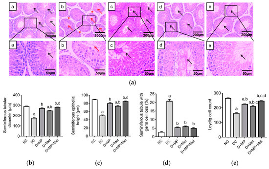 Generally, the seminiferous tubules in the testes of DC group had decreased diameters and epithelial heights. As a result, there were large inter-tubular spaces between adjacent seminiferous tubules. Many seminiferous tubules in DC group had lost a considerable amount of germ cells and had few or no spermatozoa in the seminiferous tubular lumen (Figure 2a). The testes’ histological structures were improved in the treatment groups, with the combined treatment group showing the best improvements (Figure 2a). Quantitative data obtained from the photomicrographs showed decreases (p < 0.05) in seminiferous tubular diameter, seminiferous epithelial height and Leydig cell count, and an increase (p < 0.05) in the percentage of seminiferous tubules with germ cell loss in DC group, relative to NC group (Figure 2b–e). Similarly, seminiferous tubular diameter and epithelial height decreased (p < 0.05) in the D+Met group, while Leydig cell count decreased (p < 0.05) in D+MP and D+Met groups, relative to NC group. Nevertheless, these parameters were improved (p < 0.05) in all treatment groups, relative to DC group (Figure 2b–e). Furthermore, MP exerted comparable effects with Met on seminiferous tubular diameter, epithelial height and the percentage of tubules with germ cell loss, but MP increased Leydig cell count (p < 0.05) relative to Met. Increases in seminiferous tubular diameter, epithelial height and Leydig cell count in the combined therapy group were significant relative to D+Met group (Figure 2b–e).