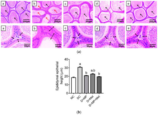 Representative photomicrographs of the caudal epididymis in (a) NC, (b) DC, (c) D+MP, (d) D+Met and (e) D+MP+Met groups (a). Histology of the epididymis of DC group showed large areas with decreased sperm density (red arrows) and increased epithelial height, relative to the NC group and treated groups (c,d,e) which showed large areas with high sperm density (black arrows) (haematoxylin and eosin staining, magnification: ×100 and ×400; scale bar: 200 µm and 50 µm for upper and lower panels, respectively). For (b) epithelial height, values are mean ± SD, n = 8. a p < 0.05 versus NC, b p < 0.05 versus DC (one-way ANOVA followed by Tukey’s post-hoc test). NC: normoglycaemic control, DC: diabetic control, D+MP: diabetic rats treated with Malaysian propolis, D+Met: diabetic rats treated with metformin, D+MP+Met: diabetic rats treated with Malaysian propolis + metformin.
