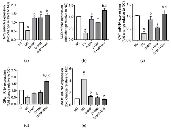 The mRNA transcript levels of Nrf2, SOD and CAT were down-regulated (p < 0.05) in DC group compared to NC group, while GPx did not differ (p > 0.05) between DC and NC groups (Figure 4a–d). On the other hand, iNOS mRNA’s transcript level was up-regulated (p < 0.05) in DC group compared to NC group. Nrf2 mRNA’s transcript level was up-regulated (p < 0.05) in D+MP, D+Met and D+MP+Met groups, relative to DC group (Figure 4a). Furthermore, SOD and CAT’s mRNA transcript levels were up-regulated (p < 0.05) in D+MP and D+MP+Met groups, relative to DC group, with levels higher (p < 0.05) in D+MP+Met group relative to D+Met group (Figure 4b–c). GPx mRNA’s transcript level was highest in D+MP+Met group (p < 0.05), relative to DC, D+MP and D+Met groups (Figure 4d), while iNOS was down-regulated (p < 0.05) in all treatment groups relative to DC group (Figure 4e). Taken together, the mRNA transcript levels of Nrf2, SOD, CAT, GPx and iNOS genes in the treatment groups were comparable to NC group, except for CAT, which was lower (p < 0.05) in D+Met group relative to NC group.