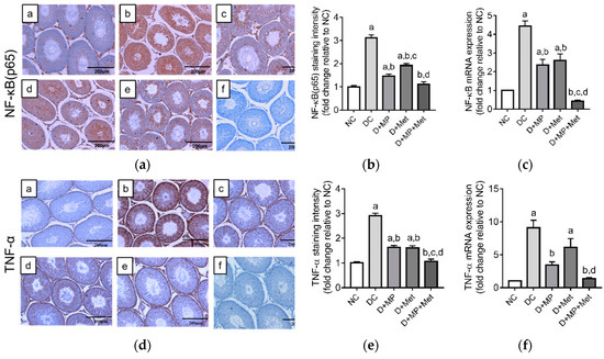 Expression of NF-κB (p65) protein (a,b) and mRNA (c); and the expression of TNF-α protein (d,e) and mRNA (f) in the testes of (a) NC, (b) DC, (c) D+MP, (d) D+Met and (e) D+MP+Met groups. For each biological replicate, a negative control was included, in which phosphate buffered saline was substituted for the primary antibody. A representative photomicrograph of the negative control is shown as (f) (magnification = ×100, scale bar = 200 µm). For quantitative data, values are mean ± SD, n = 8 (for staining intensity) and n = 6 (for mRNA expression). a p < 0.05 versus NC, b p < 0.05 versus DC, c p < 0.05 versus D+MP, d p < 0.05 versus D+Met (one-way ANOVA followed by Tukey’s post-hoc test). NC: normoglycaemic control, DC: diabetic control, D+MP: diabetic rats treated with Malaysian propolis, D+Met: diabetic rats treated with metformin, D+MP+Met: diabetic rats treated with Malaysian propolis + metformin, NF-κB: nuclear factor kappa B, TNF-α: tumour necrosis factor alpha.
