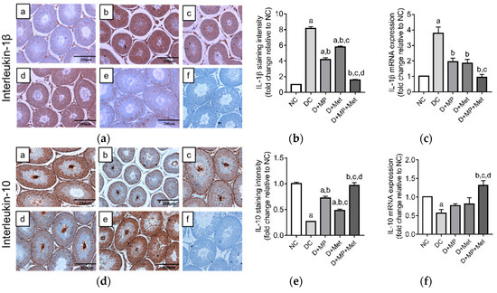 The mRNA transcript level and immunoexpression of pro-inflammatory IL-1β increased (p < 0.05), while anti-inflammatory IL-10 mRNA transcript level and immunoexpression decreased (p < 0.05) in DC group compared to NC group (Figure 6a–f). Treatment with MP, Met or their combination, down-regulated (p < 0.05) IL-1β’s mRNA level and immunoexpression, and up-regulated (p < 0.05) IL-10’s immunoexpression, relative to DC group. Only the combined therapy up-regulated (p < 0.05) IL-10’s mRNA transcript level relative to DC group (Figure 6f). Taken together, the combined therapy showed the best anti-inflammatory effect and was comparable to NC group.