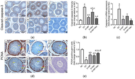 Caspase-3′s mRNA transcript level and immunoexpression increased in the testes of DC group compared to NC group (Figure 8a–c). Treatment with MP, Met or their combination decreased (p < 0.05) the expression of caspase-3 compared to DC group at both mRNA and protein levels, with comparable levels in D+MP+Met and NC groups (Figure 8a–c).