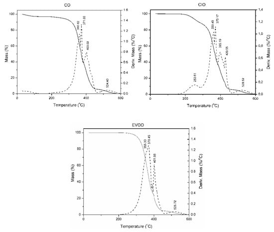 Analyzing the curves in Figure 2, the absence of any step of mass loss under 150 °C was observed, revealing the limited content of water that is usually available in vegetable oil [38]. Furthermore, the thermal oxidative decomposition processes occurred as several consecutive and simultaneous steps of mass loss in the range 200–600 °C. Specifically, the thermogravimetric curve of CIO exhibited six decomposition stages (98% weight loss), the first one between 200 and 300 °C, with 12% of mass loss caused presumably by the presence of Alpha-linolenyl chains (18:3). Santos and Souza [39] compared the thermal stability of different commercial edible oils using the thermogravimetric technique and concluded that thermal stability of oils depends on the composition of fatty acids and other factors. Specifically, oils with high levels of polyunsaturated fatty acids such as linoleic and linolenic acid will be susceptible to thermal deterioration. Thus, it was expected that CO would be less susceptible to thermal deterioration than CIO. The main and biggest oil decomposition occurred at 300–365 °C, with 36% of mass loss and the third at 365–390 °C, with a mass loss of 14%. The degradation mechanism probably corresponded to polyunsaturated fatty acids decomposition. The fourth and fifth decomposition steps were between 390 and 418 °C with mass loss of 23% and between 418 and 455 °C with mass loss of 10% was due to monounsaturated and saturated fatty acid decomposition, respectively. Finally, the last step had a weight loss centered in 528.52 °C, with a depreciable mass loss of fewer than 5%, corresponding to the oxidation of the carbonaceous residue.