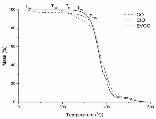 TG curve comparisons for the three different oils showing the selected temperatures corresponding to the degradation of Colliguaya integerrima (CIO), Cynara cardunculus (CO), and extra-virgin olive (EVOO) oils.