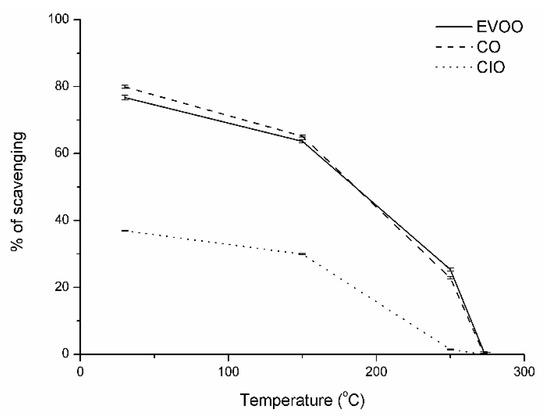 The in vitro antioxidant activities of the different oils were analyzed using DPPH assays, as seen in Figure 5. The DPPH assay is the most common method of antioxidant evaluation and it measures the ability of a compound to transform labile H-atoms to radicals. Figure 5 shows the antioxidant capacity of the different oils at each temperature studied. It is important to highlight the direct correlation between phenol contents and antioxidant activities of oils until the temperature reached 183 °C, at which point the values of DPPH for EVOO were higher than CO oils in contrast with the TPC values. This behavior could be due to the better thermal stability of EVOO oil. Specifically, in the T 30 °C, it was observed that CO oil had the highest percentage of inhibition of the DPPH (79.8%) in contrast with EVOO (76.5%) and CIO (36.9%) oils. Also, it was observed that the antioxidant activity remained in the same order despite the decrease at Tint with values of 65.2%, 63.8%, and 1.5%, respectively. Finally, the antioxidant effect dropped drastically at temperatures T0, T5%, and T10%, respectively.