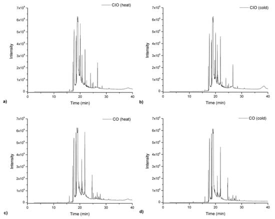 In consideration of the previous comments and taking into account the obtained results that the amount of total phenolics plays an important role in the antioxiative properties of CO, as demonstrated in DPPH assays, we studied the minor components in both oils (CIO and CO) in an attempt to obtain a full characterization for future applications of CO as edible oil. Thus, the identification of the minor components in the studied oils using the GC–MS technique. The GC–MS chromatograms of the CIO and CO oils before and after heated at 180 °C are shown in Figure 6. The GC–MS for EVOO oil was not reported in this study because there are already several reports of their minor components described in literature [44,45]. The time and temperature were chosen using the results reported by Mba et al., Andrikopoulos et al., and Naz et al., respectively [46,48,49].