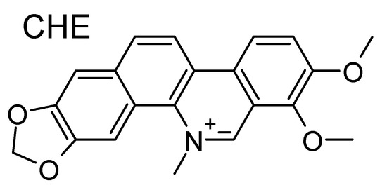 Chelerythrine (CHE; Figure 1) is an organic ligand, the capacity of which to interact with DNA while experiencing a rather good selectivity for G4s has been recently established [50]. This benzophenantridine-based alkaloid possesses remarkable biological activity, including anticancer and antibacterial properties. CHE has been shown to be able to induce significant oxidative stress, both in vitro and in cell lines [51,52], while the CHE-mediated reactive oxygen species (ROS) increase has been correlated to its possible use as an anticancer agent. Notably, CHE’s high cytotoxic effects have been observed in human prostate cancer cell lines [53]. Interestingly enough, CHE has also been shown to possess antioxidant properties leading to neuroprotection [54]. Recently, the capacity of CHE to interact selectively with K+-stabilized G4 telomeric human DNA has been evidenced. In particular, a preference for parallel and hybrid G4s over antiparallel G4 has been put forth. The selective G4 binding capacity of CHE could constitute one of the reasons for its pharmacological activity.