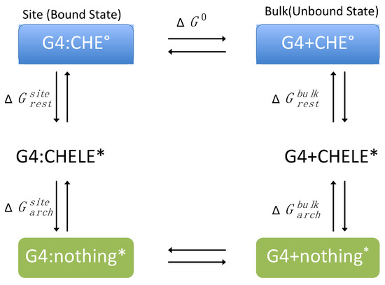 Thermodynamic cycle used for the calculation of the binding free energy (ΔG0) between CHE and the G-quadruplex (G4). The symbol * stands for a restrained state in the phase space.