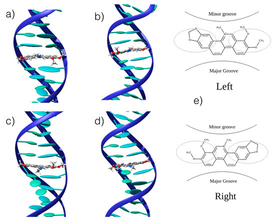 Representative snapshots of the stable interaction modes between CHE and B-DNA: (a) he-AT left orientation; (b) he-AT right orientation; (c) ho-AT left orientation; (d) ho-AT right orientation. (e) Schematic representation of the of the two competitive left and right interaction modes. The ellipsoids represent the π-stacked nucleobases. CG strands give similar structures that are reported in the Supplementary Information.