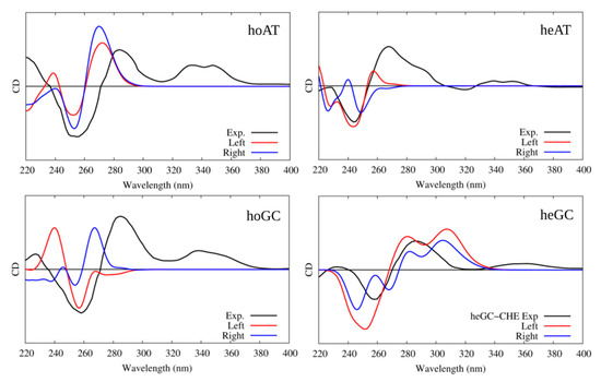 One may observe that the global shape of the experimental ECD spectra is well reproduced by the simulated results once a proper energy shift is applied. Note that the energy shift is necessary due to the use of a very simplified phenomenological Hamiltonian, such as the Frenkel coupling, and is also system-dependent and can reach values close to the eV. However, in this contest, and to allow structural observations to be rationalized, the correct reproduction of the band shape is much more important than the recovery of the absorption energies. In detail, we reproduced the typical signature characterized by the presence of a positive band at around 275–280 nm followed by a negative one at about 245–250 nm. Interestingly, in all cases, the spectra for left and right orientation of CHE are different, however, this comparison alone is not sufficient to definitively assign the dominant orientation. This aspect is particularly striking for CG strands, for which the differences in the ECD profiles are much more obvious.