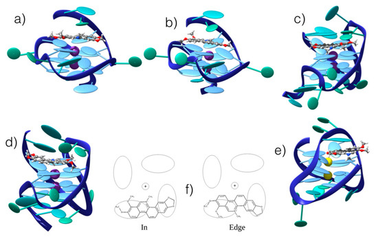 Representative snapshots of the persistent interaction modes between CHE and G4 in hybrid, parallel, and antiparallel conformations from different sequences (see Methods): (a) “edge”/parallel; (b) “in”/parallel; (c) “edge”/hybrid; (d) “in”/hybrid; (e) “edge”/antiparallel. (f) Schematic representation of the competitive “in” and “edge” interaction modes. The ellipsoids represent π-stacked nucleobases in the G4 core. Note that for antiparallel G4, only one stable interaction mode has been obtained.