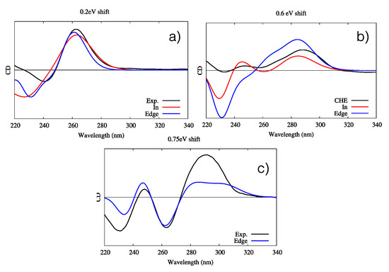 The agreement between the simulated and experimental spectra is good. Once again, this is likely by virtue of the enhanced rigidity of G4s, in particular as far as the band shapes are concerned. However, an energy shift is needed because of the use of a very simple Frenkel Hamiltonian. Indeed, the use of more elaborated methodologies, including the coupling of the transition density matrices instead of the transition dipole moment, could allow reduction of the energy shift. In the case of the parallel arrangement, both “in” and “edge” conformations give almost undistinguishable signals, making their identification virtually impossible. In the case of the antiparallel arrangement, while both conformations correctly reproduce the positive and bright peak at 260 nm, only the “in” conformation is able to yield the correct positive–negative–positive motif of the spectrum, even though the intensity ratio is less well-reproduced. Such results clearly point out the preference of CHE for the “in” binding mode. Finally, all features of the antiparallel G4’s ECD spectra are correctly reproduced by the “edge” conformation, even though the intensity of the dominant positive peak at lowest energies is underestimated compared to that of the experimental spectrum. Globally, our results prove the capacity of our protocol to correctly reproduce the main features of ECD spectra of complex systems, while also helping to unveil the complex scenario whereby the interaction with external drugs, in particular their relative conformations and modes of binding, is strongly dependent on the G4 topology. For instance, while the antiparallel arrangement shows a marked preference for the “edge” mode of binding, the opposite is true for the hybrid G4.