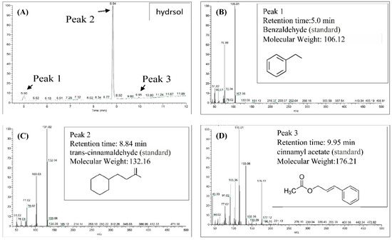 Gas chromatography/mass spectrometry (GC/MS) chromatograms of the major constituents of hydrosol from Cinnamomoum osmophloeum Kanehira (COK) leaves. (A) Hydrosol sample; Standard chemical: (B) benzaldehyde; (C) trans-cinnamaldehyde; (D)cinnamyl acetate.
