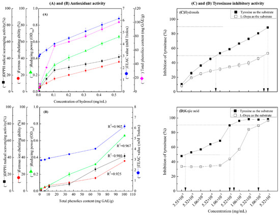 (A) Antioxidant activities of COK hydrosol produced by steam distillation; (B) overview of the relationships between total phenolic contents (TPCs) in hydrosol and antioxidant activities; (C,D) dose-dependent inhibition of monophenolase and diphenolase activities of tyrosinase using L-tyrosine and L-DOPA as substrates, respectively. Values represent means ± standard deviations (SD; n = 3.).