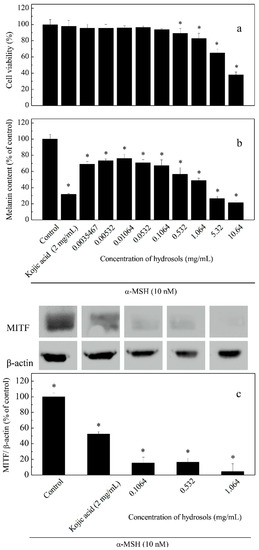 Effects of hydrosol concentrations on cell viability (a), melanin contents; (b) and expression levels of tyrosinase and microphthalmia-associated transcription factor (MITF); (c) in α-melanocyte-stimulating hormone -treated B16-F10 cells. Data are presented as means ± SD from three independent experiments; * p < 0.05 compared with the untreated group.
