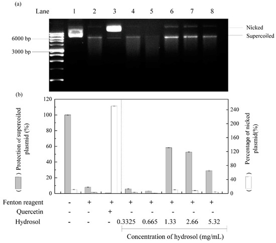 Effects of hydrosol in pCI neo DNA protection assays; (a) agarose gel of pCI neo DNA after exposure to Fenton reagents and protective treatments; (b) percentage quantification of supercoiled and nicked pCI neo forms; Lane 1, pCI neo DNA, negative control; Lane2, pCI neo + Fenton reagents, negative control; Lane3, pCI neo + Fenton reagent + 250 mg/mL quercetin, positive control; Lanes 4–8, pCI neo + Fenton reagent + various concentrations of hydrosol.