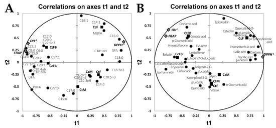 Partial least squares regression (PLSR) analysis was used to define the possible interrelationships between the chemical composition (based on their phenolic (Table 2) and fatty acid (Table 3) profiles) (independent variables, X) and AO activity (DPPH•, OH• and FRAP, dependent variables, Y; reciprocal values of IC50 for anti-DPPH and anti-OH radical activities, Table 1) of the analysed methanolic extracts. Firstly, PLSR was performed for all three AO measures, resulting in the correlation circles between the extracts, their fatty acid (Figure 1A) or phenolic (Figure 1B) profile and AO measures, with first two PLSR components (t1, t2). Although the global R2 between Y and (t1, t2) (which gives an upper bound of how well the model explains the data and predicts new observations) is slightly higher for the phenolic profile (0.962), compared to the fatty acid one (0.934), the quality of the former regression is lower since R2 resulting from the cross-validation (Q2cum), that defines the stability of the model and sets the lower bound of how well the model explains the data [38], is 0.389, compared to 0.686 for the fatty acid profile. Figure 1 shows that all dependent variables are located at the periphery of the correlation circle meaning that can be explained by the concentrations of fatty acid or phenolic compounds located either in their vicinity (e.g., C22:2 or cinnamic acid, in the case of OH•) exhibiting a positive (antioxidative) influence, or opposite to them (e.g., C18:3n3 or vanillic acid, in the case of OH•) displaying a negative (pro-oxidative) one.