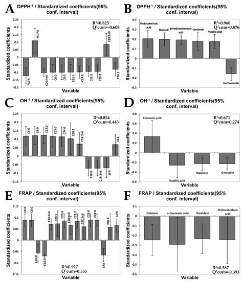 Although the correlation circle is useful for gaining the overall picture, it actually doesn’t indicate (specify) which combination of fatty acid or phenolic compounds has statistically significant influence on the specific measure of AO activity of the analysed mushrooms extracts. In order to estimate this, a separate one-component PLSR model was built for each dependent variable. The models were then pruned until all variables with insignificant standardised regression coefficients (confidence intervals include 0) were deleted. Bar graphs of the regression coefficients for all three models are shown in Figure 2. Upwards and downwards pointing bars indicate positive (antioxidative) and negative (pro-oxidative) influences, respectively. Comparison of R2 and Q2cum values clearly pointed out that AO activity of the extracts measured by FRAP assay was much better explained by PLSR model based on their fatty acid profiles (Figure 2E, R2 = 0.927, Q2cum = 0.535) versus the phenolic ones (Figure 2F, R2 = 0.567, Q2cum = −0.393). Practically, entire variability (92.7%) in the AO activity of the extracts measured by FRAP assay can be explained by coordinated antioxidative potential of unsaturated fatty acids (UFAs) (C18:2n6, C20:1, C20:2, C20:4n6, C22:2 and C22:1n9) followed by short (C6:0 and C8:0) or long (C23:0 and C24:0) chain saturated fatty acids (SFAs). Since palmitic and stearic acids were by far most abundant SFAs, SFAs generally may be linked with pro-oxidative action, unlike UFAs and PUFAs (Figure 2E). Similarly to FRAP, anti-OH radical activity of the extracts is also much better explained by PLSR model based on their fatty acid profiles (Figure 2C, R2 = 0.854, Q2cum = 0.443), compared to the phenolic ones (Figure 2D, R2 = 0.671, Q2cum = 0.274). Such a trend is actually expected due to a strong correlation between FRAP and OH• values (R = 0.932, p = 0.007), that is confirmed by their close position at the correlation circle (Figure 1A), too. In fact, due to such a tight correlation, OH• PLSR model is essentially based on the identical fatty acids as FRAP PLSR model (Figure 2C). Contrary to FRAP and OH assays, the PLSR model based on the phenolic profiles of the extracts (Figure 2B, R2 = 0.960, Q2cum = 0.876) much better explains their anti-DPPH radical activity, compared to the model based on the fatty acid profiles (Figure 2A, R2 = 0.825, Q2cum = −0.608). Protocatechuic acid, daidzein, p-hydroxybenzoic acid, genistein and vanillic acid are phenolics suspected to primarily contribute to anti-DPPH radical activity, unlike the flavonol isorhamnetin that is, indeed, likely to display pro-oxidative activity (Figure 2B).