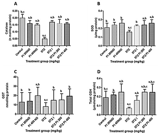 Effects of protein isolate from Parkia biglobosa on (A) catalase, (B) SOD and (C) GST activity as well as (D) total GSH level in experimental animals. Data in the figure above represents mean ± standard deviation, n = 10. a—compared with control, b—compared with STZ only, c—compared with treated non-diabetic groups. Values are statistically significant at p < 0.05. SOD: superoxide dismutase; GST: Glutathione S-transferase; GSH: Reduced glutathione.