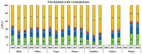 Figure 1. Nutritional profile showing the oil, protein, ash, and carbohydrate contents (g 100 g−1 seed) of hemp seeds from the seven industrial hemp cultivars cultivated in this study and for three growing seasons (2016, 2017, and 2018). For each year, means within columns in the same color followed by the same letter (lower case, capitals, and lower case in bold for 2016, 2017, and 2018, respectively) are not significantly different (p > 0.05).