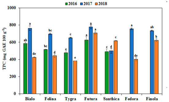 Figure 2. Total phenolic content (TPC) of hemp seeds from the seven industrial hemp cultivars cultivated in this study for three growing seasons (2016, 2017, and 2018). For each year, means within the column in the same color followed by the same letter are not significantly different (p > 0.05).