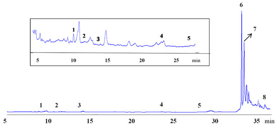 Figure 3. High performance liquid chromatography (HPLC) chromatogram of Felina hempseed phenolic extract at 280 nm. Peaks identification: 1, protocatechuic acid. 2,4-hydroxybenzoic acid. 3, vanillic acid. 4, p-coumaric acid. 5, ferulic acid. 6, N-trans-caffeoyl-tyramine. 7, cannabisin A. 8, cinnamic acid.