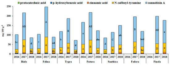 Figure 4. The main phenolic acid components of hemp seeds from the seven industrial hemp cultivars cultivated in this study for three growing seasons (2016, 2017, and 2018). For each year, means within the column in the same color followed by the same letter (lower case, capitals, and lower case in bold for 2016, 2017, and 2018, respectively) are not significantly different (p > 0.05) (N-trans-caffeoyl-tyramine and cannabisin A are expressed in trans-cinnamic acid equivalents).