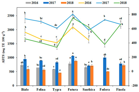 Figure 5. Antioxidant activity of extracts of hemp seeds from the seven industrial hemp cultivars cultivated in this study and for three growing seasons (2016, 2017, and 2018) as measured by 2,2′-azino-bis (3-ethylbenzthiazoline sulfonate) (ABTS) and ferric-reducing antioxidant power (FRAP) assays. For each year, means within the column in the same color or in the same line followed by the same letter are not significantly different (p > 0.05).