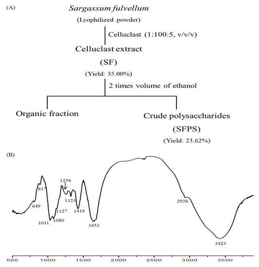 Preparation and characterization of SFPS. (A) Extraction protocols; (B) FTIR spectrum of SFPS.