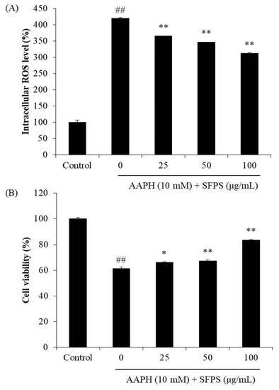 Protective effect of SFPS against AAPH-induced intracellular reactive oxygen species (ROS) production (A) and cell death (B) in Vero cells. Intracellular ROS level was measured by 2,7-dichlorofluorescein diacetate (DCFH-DA) assay, and cell viability was determined by MTT assay. The data are expressed as means ± standard error (SE) (n = 3). *p < 0.05, ** p < 0.01 as compared to the AAPH-treated group and ## p < 0.01 as compared to the control group.