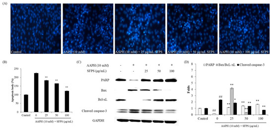 The protective effects of SFPS against AAPH-induced apoptosis in Vero cells. (A) Morphology of the Hoechst-stained Vero cells; (B) relative apoptotic body level; (C) expression levels of apoptosis-related proteins; (D) relative amounts of PARP, Bax, Bcl-xL, and cleaved caspase-3. The apoptotic body formation was observed using a fluorescence microscope after Hoechst 33342 staining. The relative amounts of PARP, Bax, Bcl-xL, and cleaved caspase-3 were compared with GAPDH. The relative apoptosis and proteins levels were measured using Image J software. The data are expressed as means ± SE (n = 3). ** p < 0.01 as compared to the AAPH-treated group and ## p < 0.01 as compared to the control group.