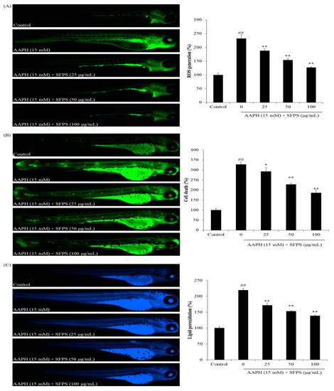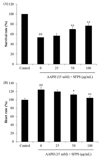 Adult zebrafish were maintained according to a previous study [39]. Approximately 7–9 h post-fertilization (hpf), the zebrafish embryos (12-well plate, 15 embryos/well) were incubated in embryo medium containing 25, 50, and 100 μg/mL of SFPS for 1 h. Then, 15 mM AAPH was added to each well, and the embryos were incubated with AAPH until 24 hpf. The zebrafish experiment received approval from the Animal Care and Use Committee of the Jeju National University (Approval No. 2017-0001).