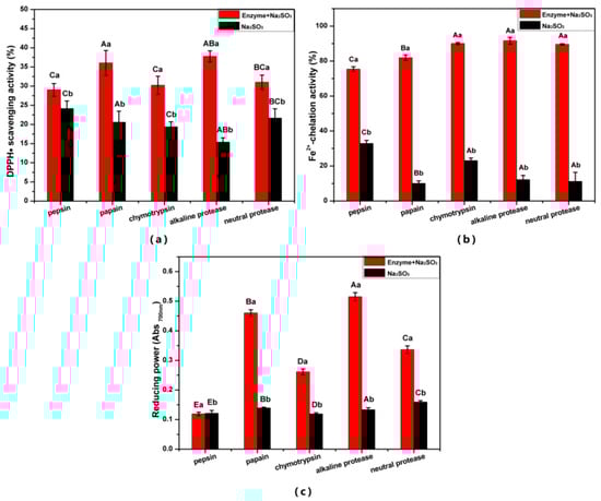 Effects of enzymes species (9 U/mg) on the antioxidant activity of eggshell membrane enzymatic hydrolysate (ESM-EH) with the assistance of 30 mM Na2SO3. (a) DPPH•-scavenging activity; (b) Fe2+-chelating ability; (c) reducing power. Differences in lowercase letters indicate significant differences between enzyme + Na2SO3 treatment group and Na2SO3 treatment group (p < 0.05), and the difference of capital letters shows the significant difference of enzyme species (p < 0.05).