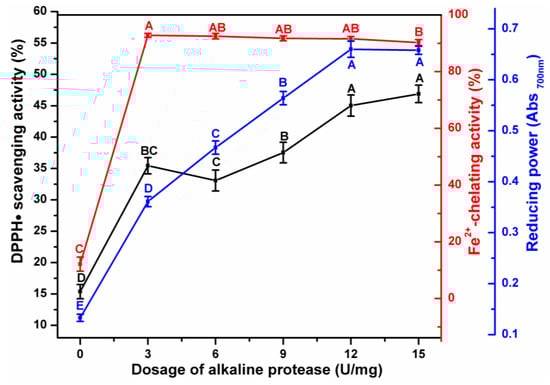 Effect of alkaline protease dosage on antioxidant activity of ESM-EH with the assistance of 30 mM Na2SO3. DPPH•-scavenging activity (black line); Fe2+- chelating ability (red line); reducing power (blue line). The different capital letters indicate significant differences (p < 0.05).