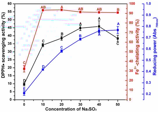 Effect of different concentrations of Na2SO3 on the antioxidant activity of ESM-EH produced by alkaline protease treatment. DPPH•-scavenging activity (black line); Fe2+-chelating ability (red line); reducing power (blue line). The different capital letters indicate significant differences (p < 0.05).