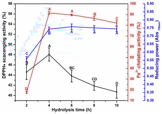 Effect of hydrolysis time (12 U/mg alkaline protease with 40 mM Na2SO3) on antioxidant activity of ESM-EH. DPPH• scavenging activity (black line); Fe2+-chelating ability (red line); reducing power (blue line). The different capital letters indicate significant differences (p < 0.05).