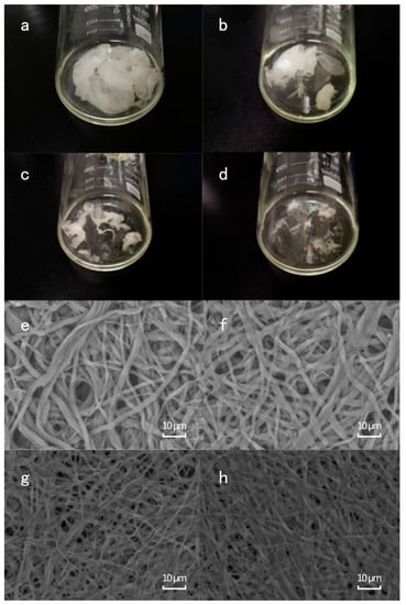 Visual image of alkaline protease and Na2SO3 combination at different times: (a) 0.5 h; (b) 1 h; (c) 1.5 h; (d) 2 h. ESM images of different treatment groups: (e) sodium sulfite treatment alone for 4 h; (f) alkaline protease alone for 4 h; (g,h) sodium sulfite + alkaline protease treatment ((g) 1 h, (h) 1.5 h).