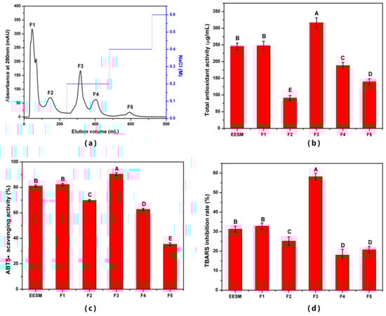 (a) Separation of ESM-EH by cation exchange chromatography. (b) TAA, (c) ABTS• scavenging rate, and (d) TBARS inhibition rate of isolated fragments. The different capital letters indicate significant differences (p < 0.05).