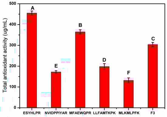 Determination of total antioxidant activity of five predicted peptides. The different capital letters indicate significant differences (p < 0.05).
